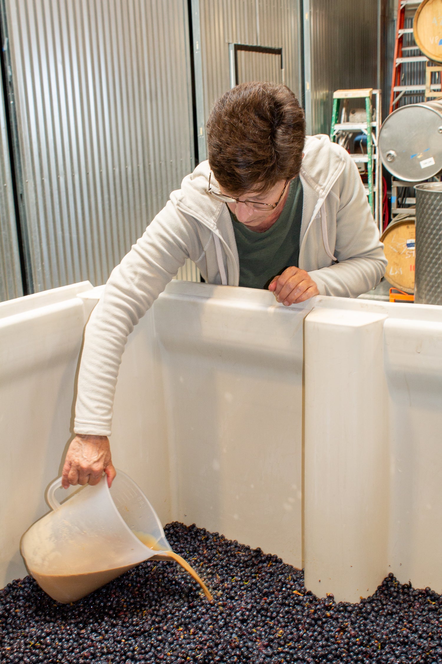 After sorting and de-stemming red wine grapes, Winemaker Melissa adds the yeast to start fermentation. Two weeks later, they will be ready to press and begin the aging process.