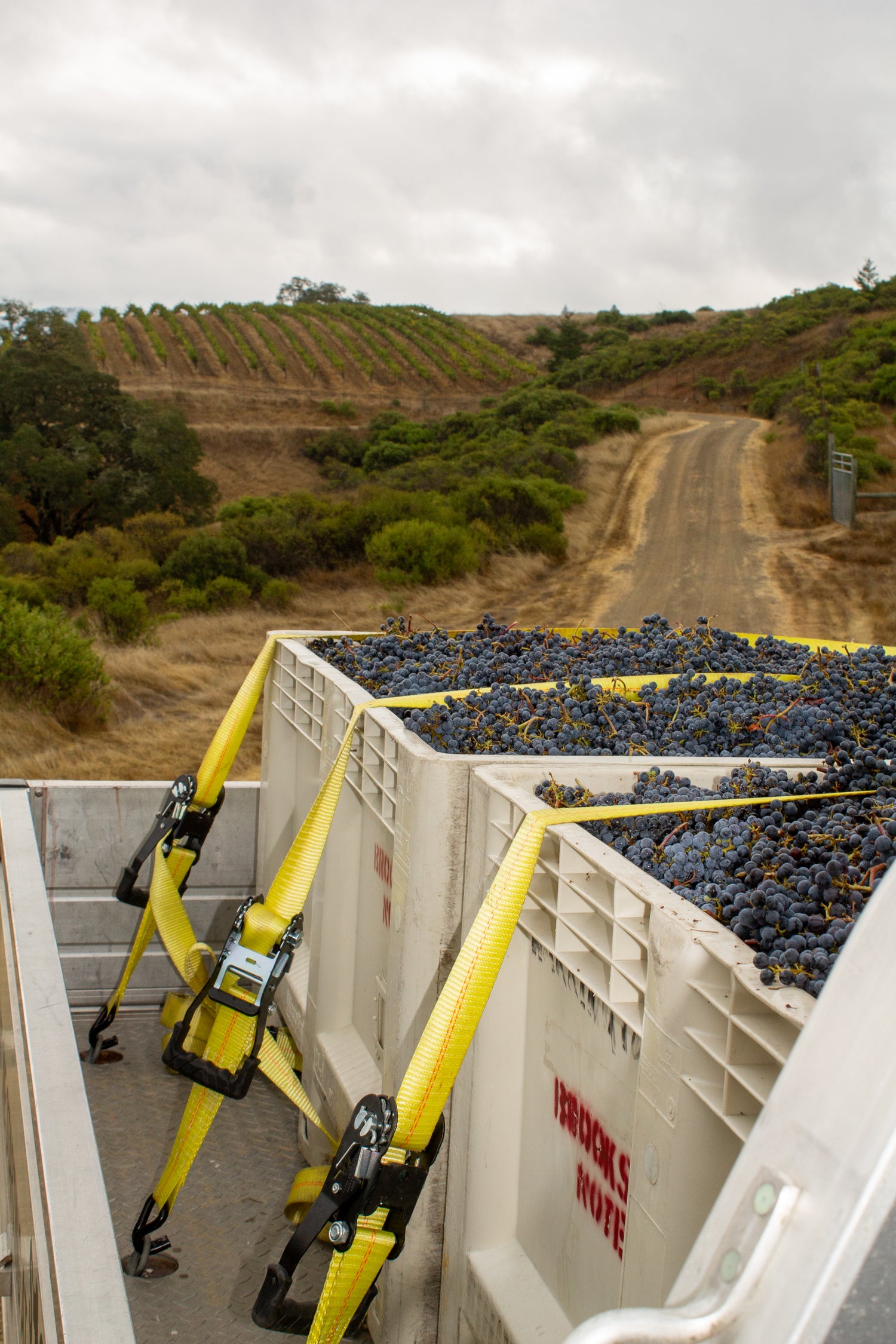 Following harvest, we transport our grapes along winding backroads and freeways to Brooks Note Winery in Petaluma, CA.