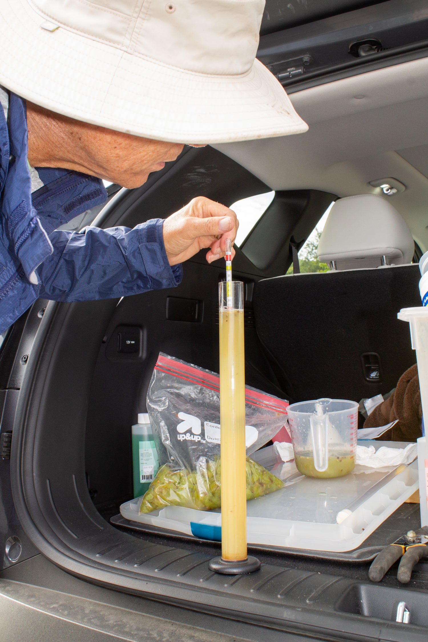 Here, Leap 29 Winemaker Frank uses a hydrometer in our temporary field lab: our car's trunk.